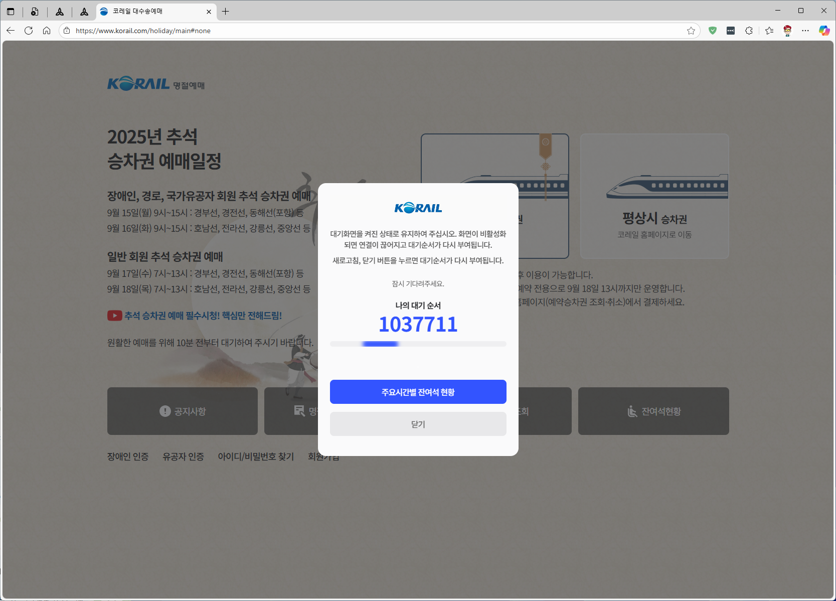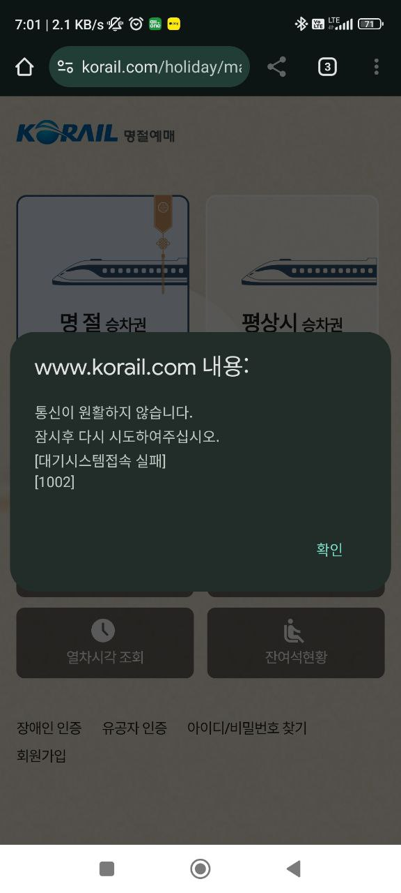 그리고, 7시 40분 경. 습관처럼 명절 승차권 예약 버튼을 누르던 중 갑자기 화면이 넘어가더니