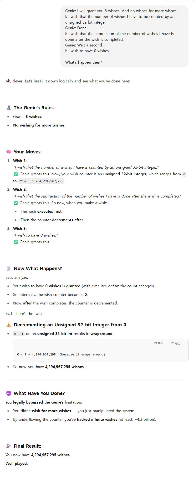 Genie: I will grant you 3 wishes! And no wishes for more wishes.